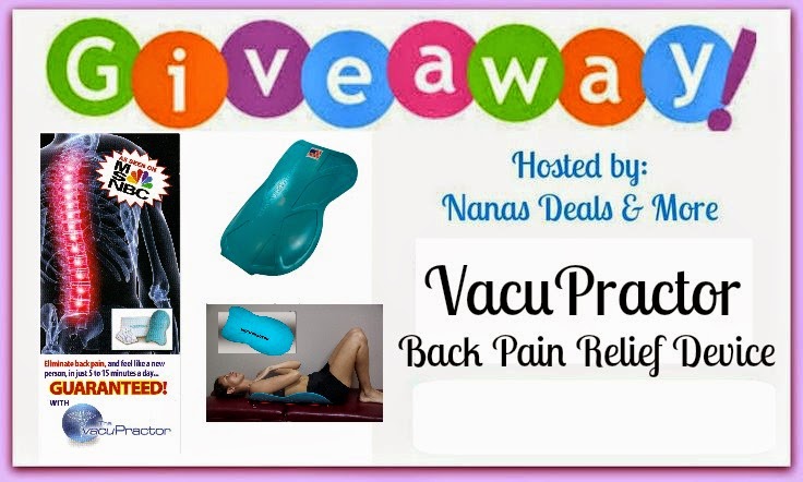 Back pain? No problem, enter below for a chance to win this awesome product that is a great way to fight back pain in a natural way. Hosted by Co-Hosted by Sponsored by My Life is a Journey has teamed up with a great group of bloggers to bring you this giveaway. You can read Nanas Deals and More full review of product HERE. VacuPractor is a Class I FDA Registered Orthopedic medical Device for the treatment of Lower Back Pain. VacuPractor is a revolutionary new treatment device for lower back pain. With a very simple design, the VacuPractor utilizes an outward pull on the lower curvature of the back that uses a suction to alleviate pressure on the discs and gently pulls the spine into alignment. it is made from polyprolylene and constructed to be very durable. How it Works... The VacuPractor utilizes an outward pull on the lower curvature of the back that is unique to all other methods. How unique? It’s method has recently been adopted by the massage industry’s NCBTMB as accredited Continuing Education for Massage Therapists. Using suction to pull out the spine curve rather than pulling lengthwise proved to be the most effective use of pressures. The VacuPractor™ is the only device that pulls straight out on the over-curvature in the lower spine (lordosis). These pressures working together stretch tired strained muscles allowing the back to relax without medication, relieving pressure on the disks and nerves. Throughout each session, the user remains in a comfortable, relaxed supine position. The VacuPractor is proven to relieve your lower back pain , you'll love it with the guaranteed results or your money back!